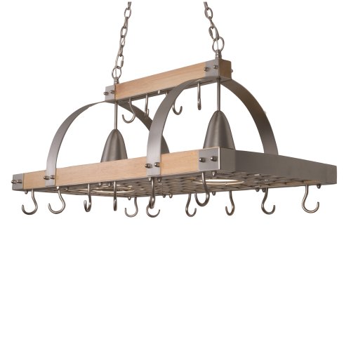 The Country Kitchen P1006-71 two-light wooden pot rack with oak frame keeps your kitchen organized and efficient while creating a country feel with its wooden accent. This pot rack's utensil hooks slide easily inside a wooden track. A brushed nickel finish accents the oak frame, with lighting provided by two R20-type 50-watt bulbs (not included).