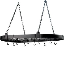 - Hanging, half-circle cookware wall rack